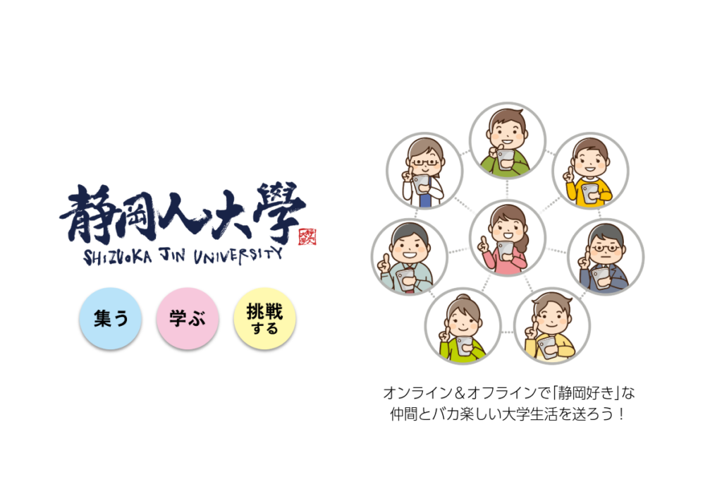「静岡人大学」は、静岡が好きという気持ちをきっかけに、人と人がゆるやかにつながっていくオンラインコミュニティです。